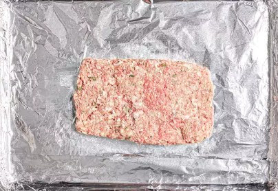 - Line rimmed baking sheet with aluminum foil. With moist hands, form meat mixture into rectangles about 1 1/2-inches high, 8-inches long, and 5-inches wide. Bake until center of loaf reads 155°F (68°C) on an instant-read thermometer, about 30 minutes. Allow loaf to rest at room temperature for 15 minutes (or refrigerate for up to a week, see notes).