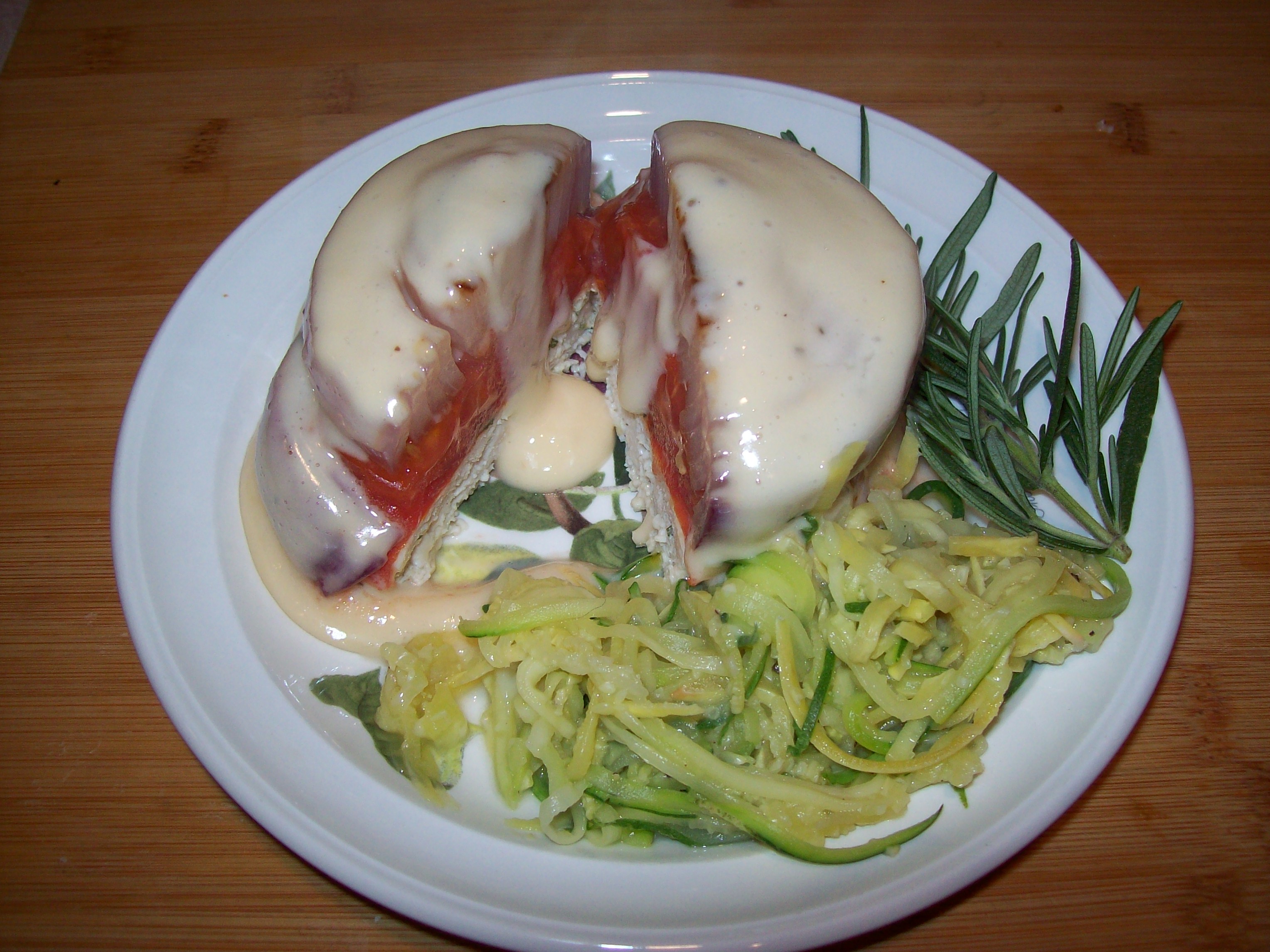 5. Pile the tomato and onion slices on top of the turkey steaks. Spoon the cheese sauce on top, and serve.