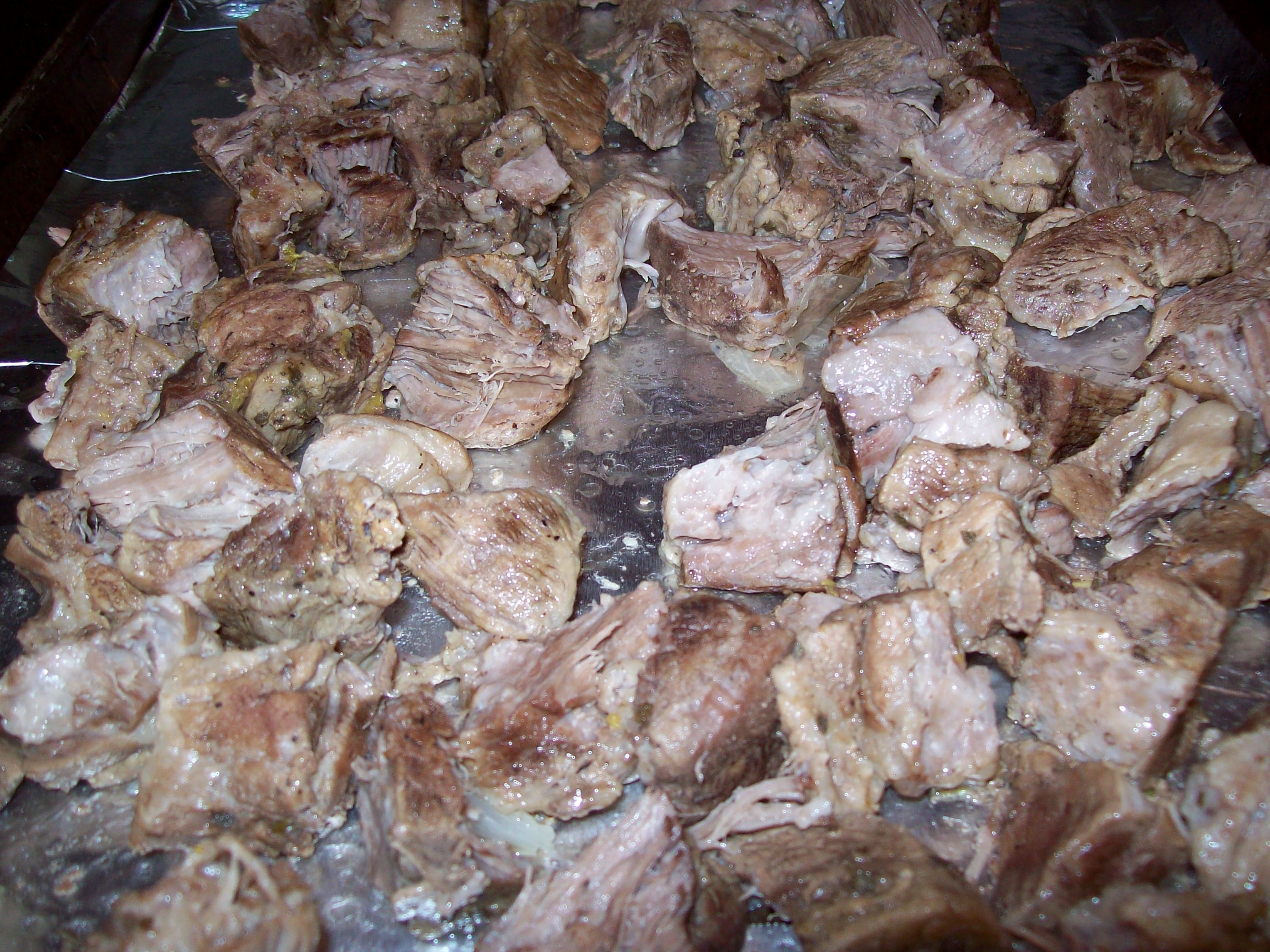 4. Spread the pork back onto the foil lined pan and evenly spread the meat around so there is a single layer of meat. Place the jelly roll pan on the lower middle rack of the oven and broil until the top of the meat is well browned and edges are slightly crisp, about 5 to 8 minutes.