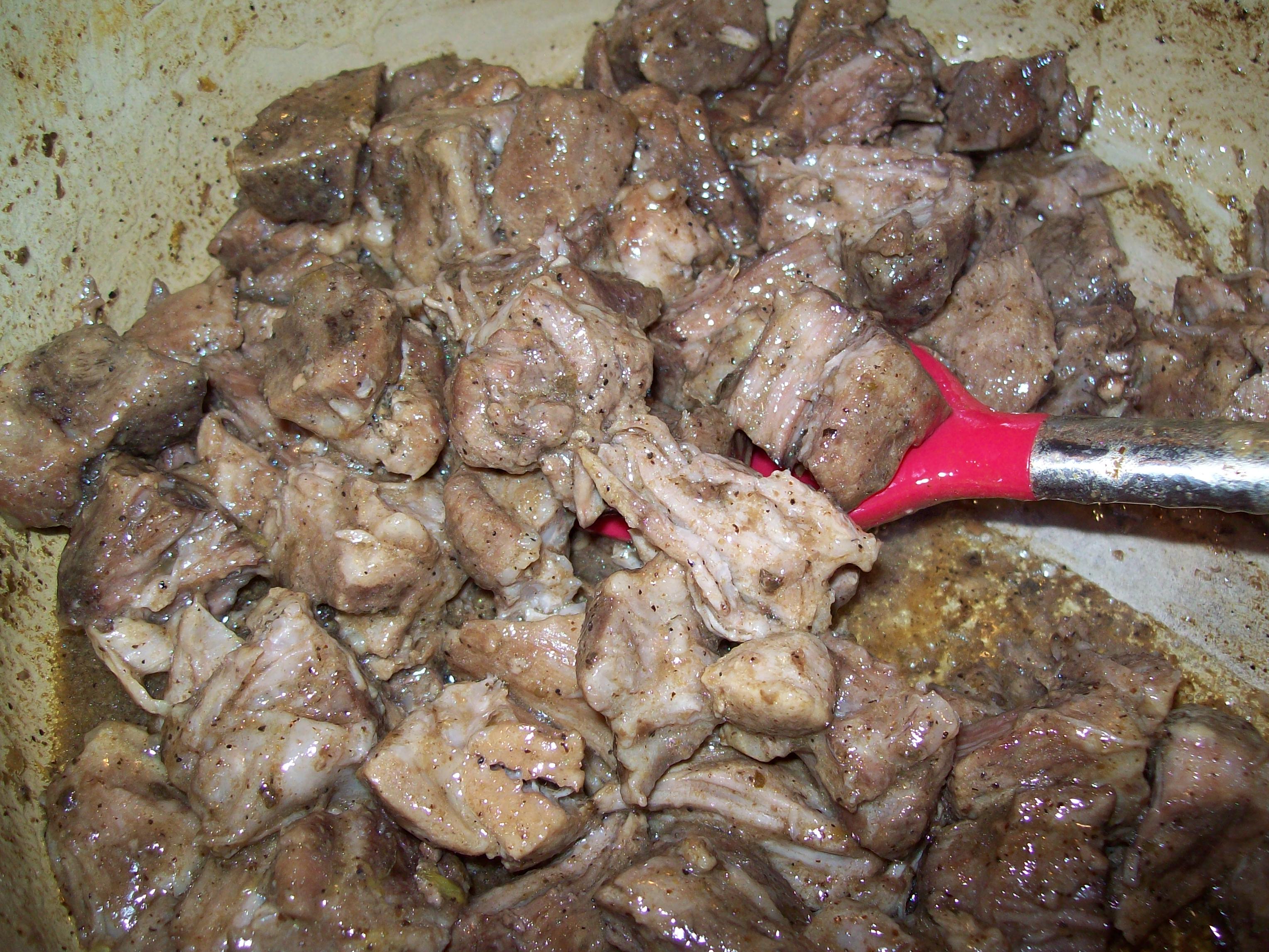 3. While the liquid is reducing, use two forks to pull each cube of pork into three equal sized pieces.