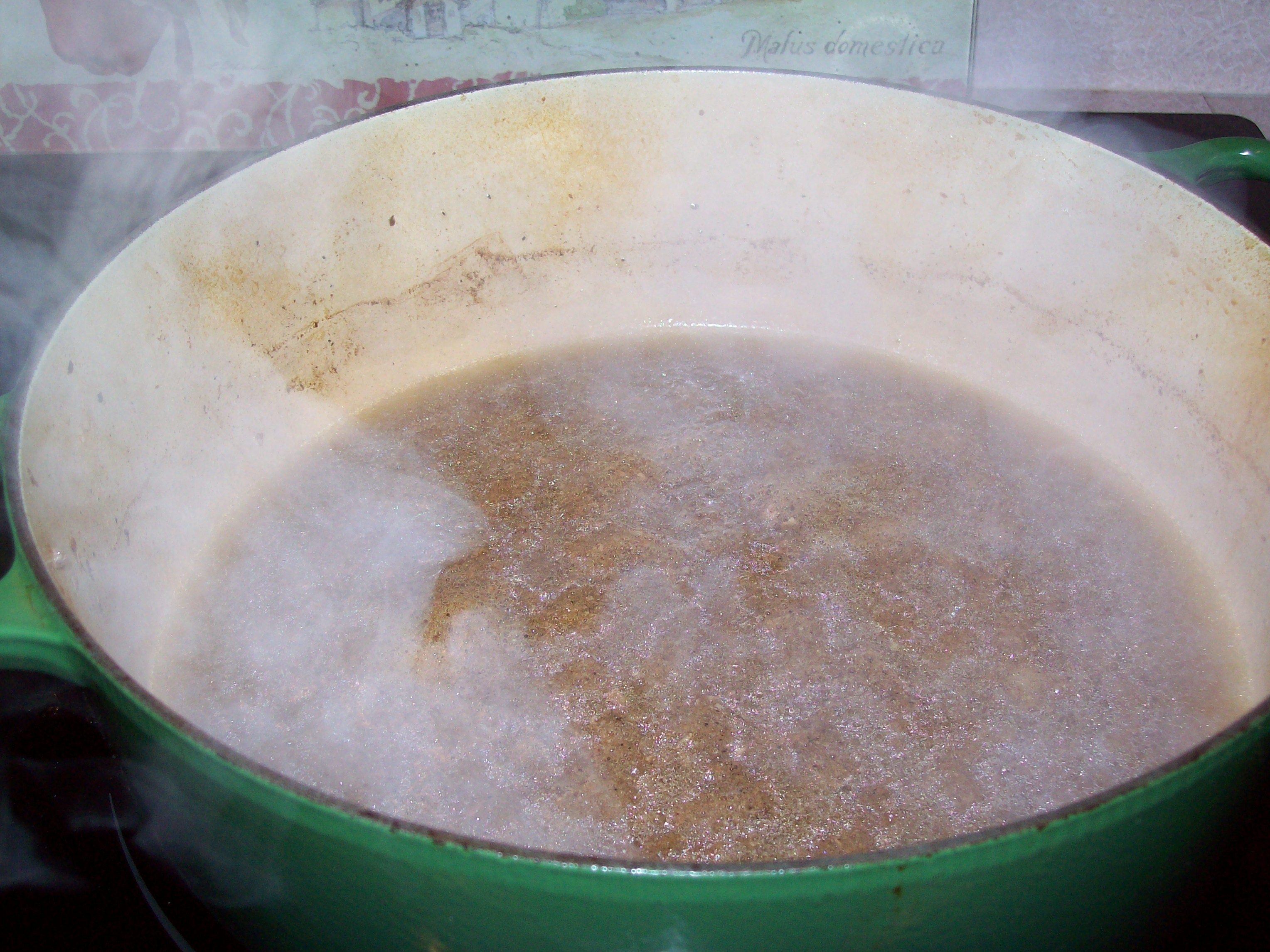 2. Remove the pot from the oven and turn on the broiler. Use a slotted spoon to remove the meat from the pan and place it on a large foil-lined jelly roll pan. Remove and discard everything from the pot except for the cooking liquid. Place pot over high heat on the stove and boil until thick and syrupy, about 20 minutes. You should have about 1 C of liquid remaining when it is finished.