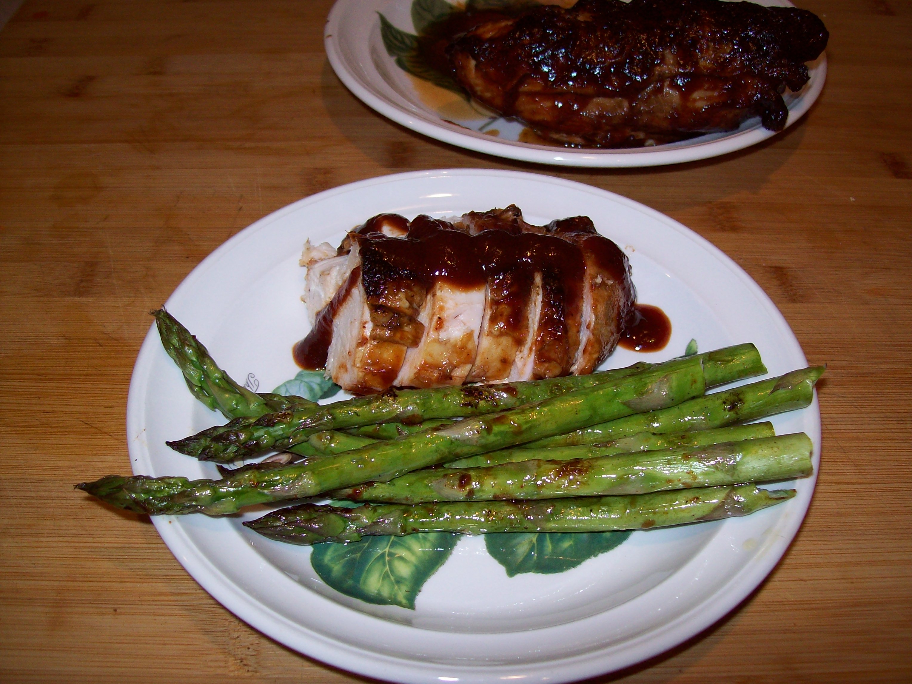 cook 15-25 minutes cover both side with another 1/3 cup and continue to cook skin side up on the cold side of grill. Cook until it reaches about 160 degree, remove from grill cover loosely for about 10 minutes. While this was resting I grilled some fresh asparagus. Did you know that asparagus are better for you when eaten raw? Try it they are good, I julienned and used in coleslaw and in my minced chicken lettuce wraps.