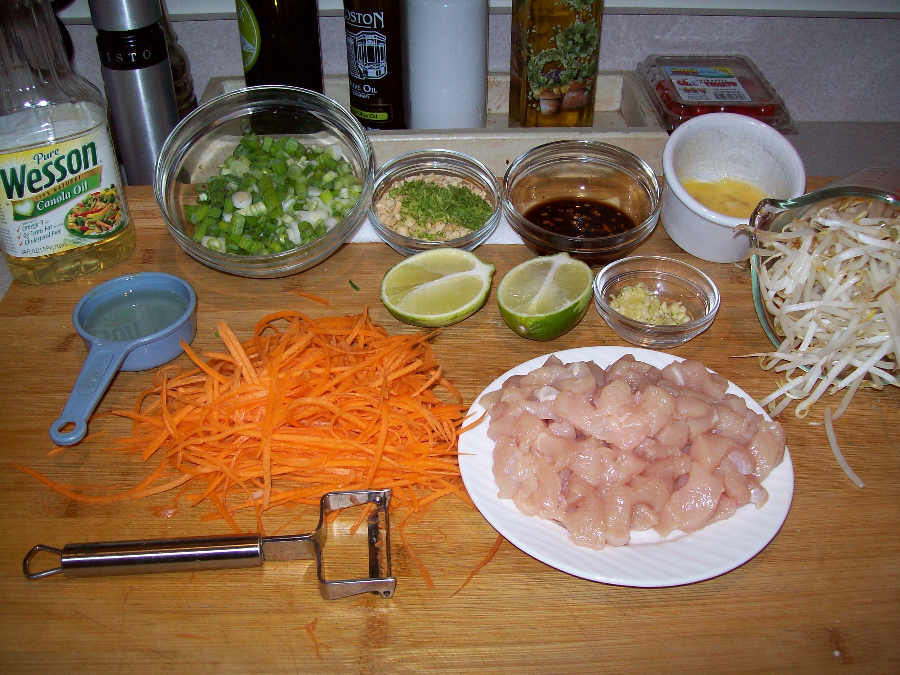 Pour the sauce into the wok and add the chicken-shrimp mixture, egg, bean sprouts, and scallions. Gently toss to heat through, and squeeze the juice of one lime half over all. Garnish with the peanuts and serve with the other half lime available for table-side squeezing. Any leftovers can be refrigerated for up to 4 days.