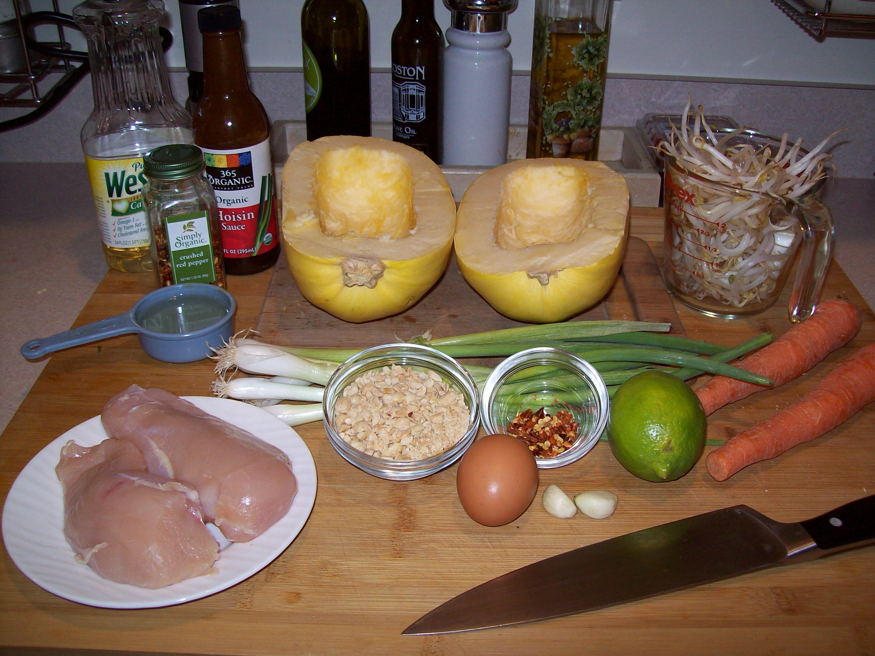 Brush the cut sides of the squash with 1 tablespoon of the peanut oil. Place the squash, cut sides down, on a baking sheet and roast for 30–40 minutes. The squash is cooked when a knife easily pierces through the skin and flesh. Let cool, use a fork to shred the flesh into spaghetti-like strands, and set aside.