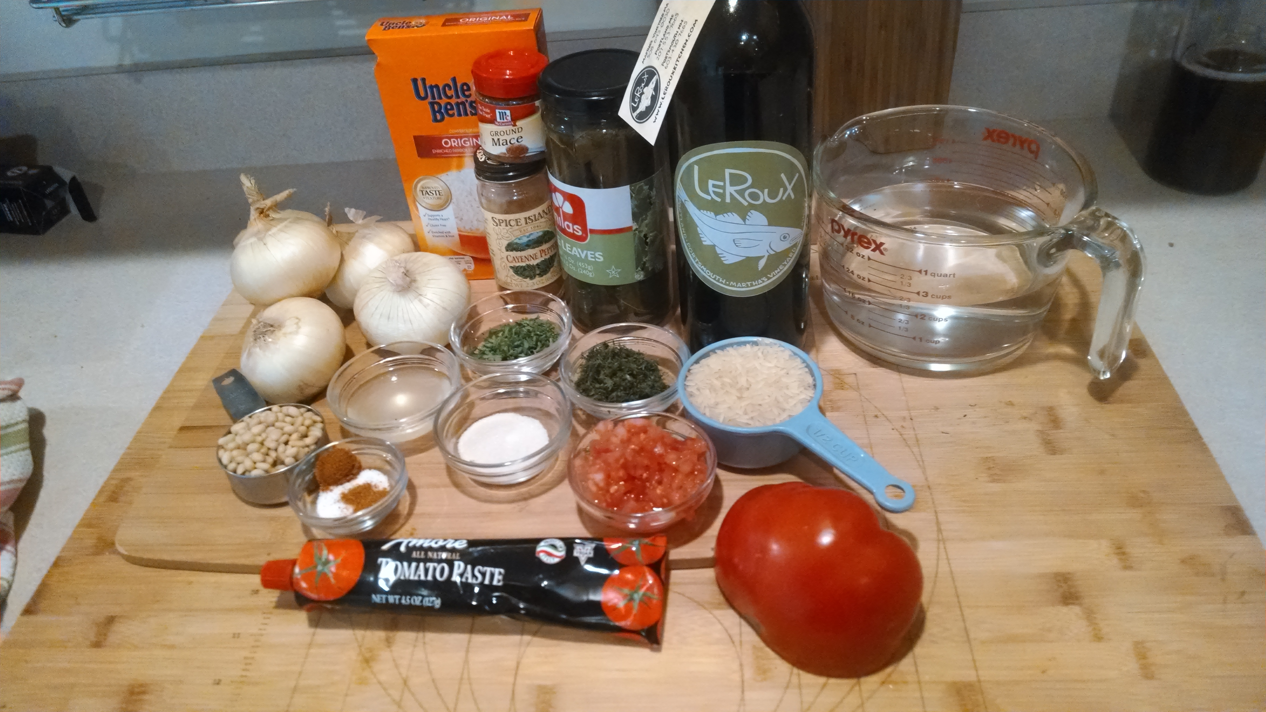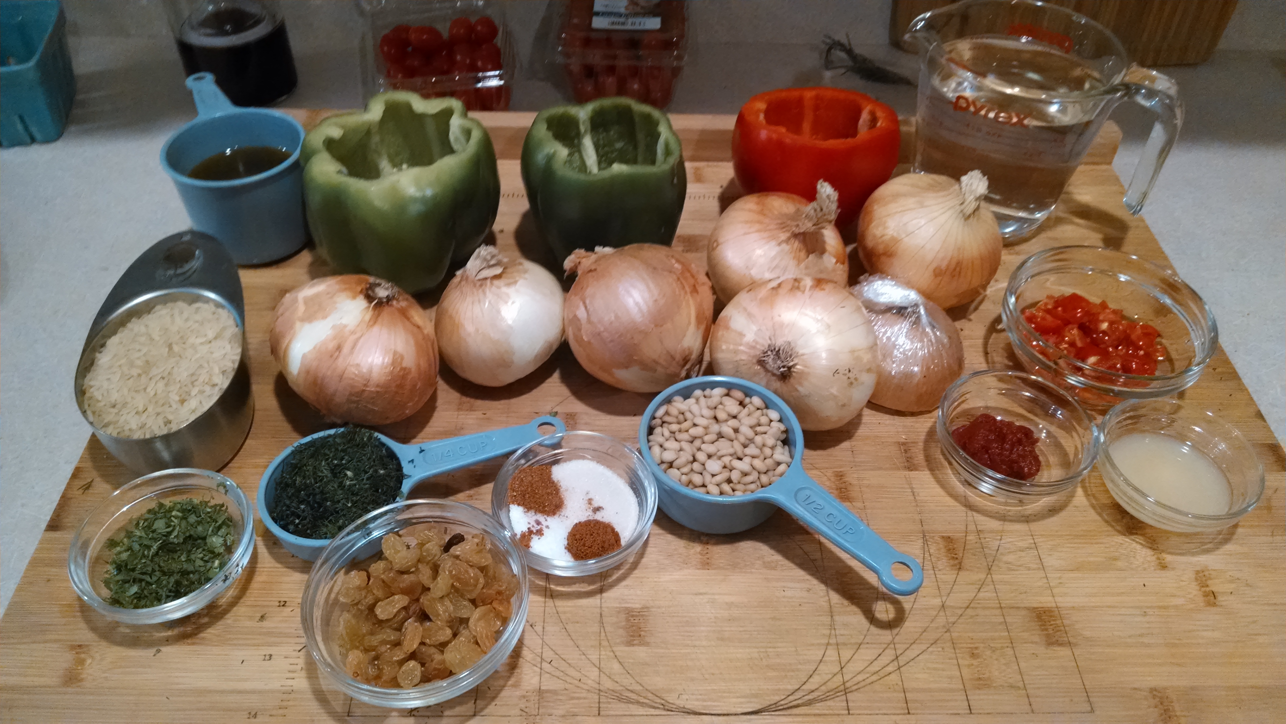 Prepared two things separate times, stuffed grape leaves and stuffed peppers booth same recipe just different holders so to speak. I made these months ago not sure why I have delayed posting perhaps it was a traumatic experience for me. The first batch I had some left over stuffing and a red peeper so tried that out. Hence the second batch was just the peppers. Thanks to Richard for loaning me his Armenian Cooking Today book. Now I know what to do with all the grape leaves that grow in the woods beside, around the house and neighborhood. Through him, his aunt suggest only using the younger leaves. I tried this with store bought and learned that one should definitely soak the leaves in water to get rid of the salt which seemed to grow stronger as the days went on.