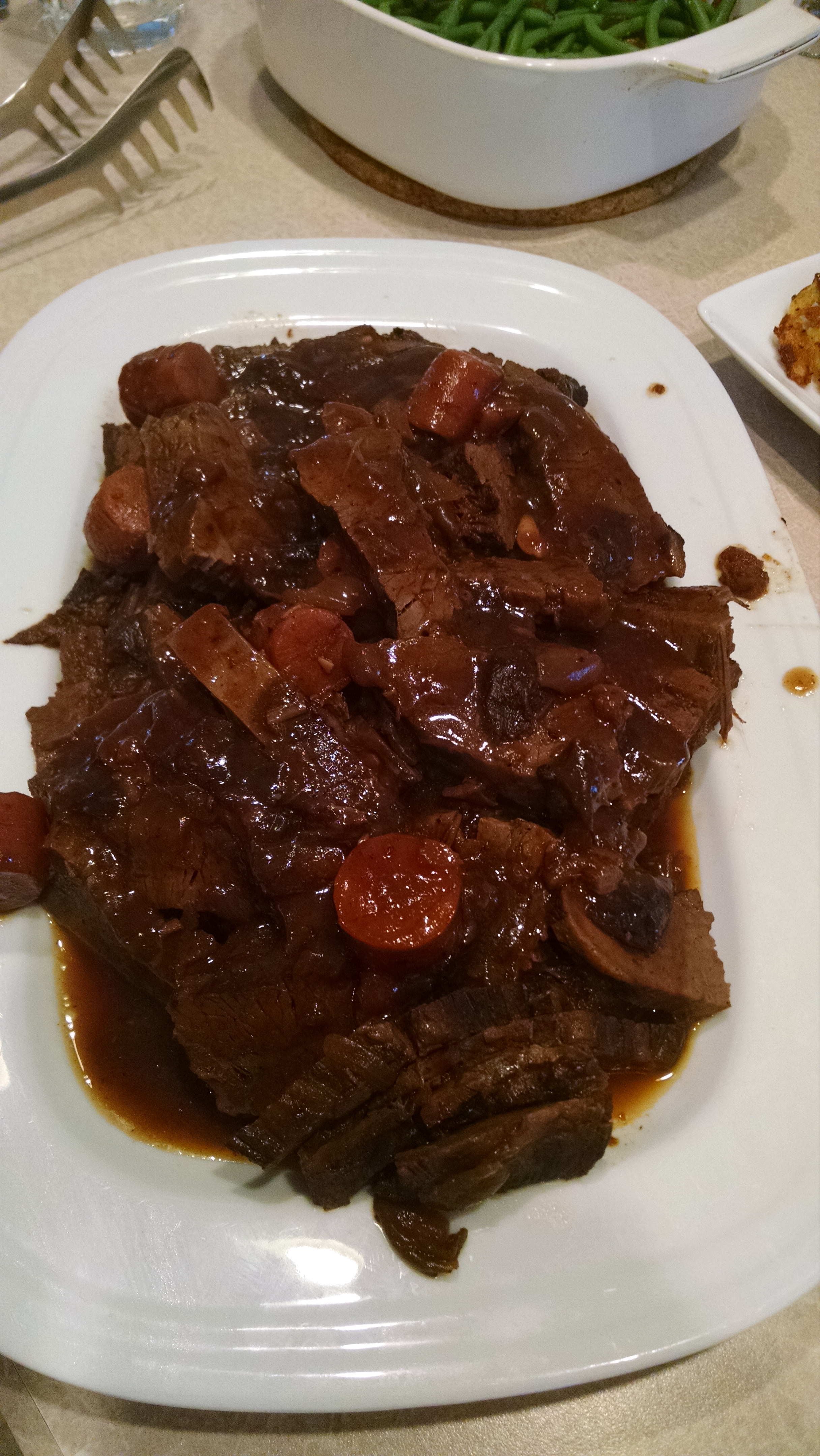 My nice Roman Catholic wife decided that she did not want a turkey this year for Xmas dinner and that a brisket would be nice. I found a recipe with red wine and that was the plan until the trip to Whole foods could not yield a 6 pound Brisket. I was taken by surprise and kind of stood there with a blank spare, Lyn was down another isle all the pressure was on my shoulders, the plan in my head thrown off kilter. The butcher said here just cook these together stacking 2 three pounders on top of each other. I mumble sure what else can I do. On the way to break the news to Lyn it came to me our first annual Brisketathon. Two different brisket styles the ultimate taste treat. Lyn found this recipe from an old email from Missi said it was the best meat she ever had at this party, she got out the recipe it had red wine. Keep in mind she was then and still is basically a vegetarian, or Raw food and what I fondly call her witches brews. Flax seed in ….. how awful I used to say – used to the key phrase here I have now issue with Flax seed now. I had found another red wine version on the Jewish Journal. Mike was excited about the menu and was looking forward to Xmas dinner.