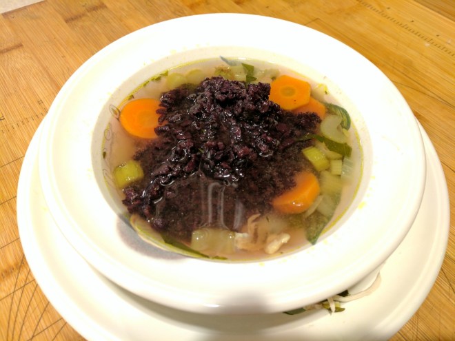 January 7, 2017 by stevesacooking Lyn’s chicken and black rice soup It’s snowing out and they are forcasting up to 8″. Nothing better than a hot cup of soup on a snowy afternoon. Warms the soul. Sorry about the reflection in the bowl. Share my babble with a friend: Click to share on X (Opens in new window) X Click to share on Pinterest (Opens in new window) Pinterest Click to email a link to a friend (Opens in new window) Email Click to share on Facebook (Opens in new window) Facebook Click to share on LinkedIn (Opens in new window) LinkedIn Click to share on Tumblr (Opens in new window) Tumblr Click to share on Reddit (Opens in new window) Reddit Click to print (Opens in new window) Print Like Loading... Related