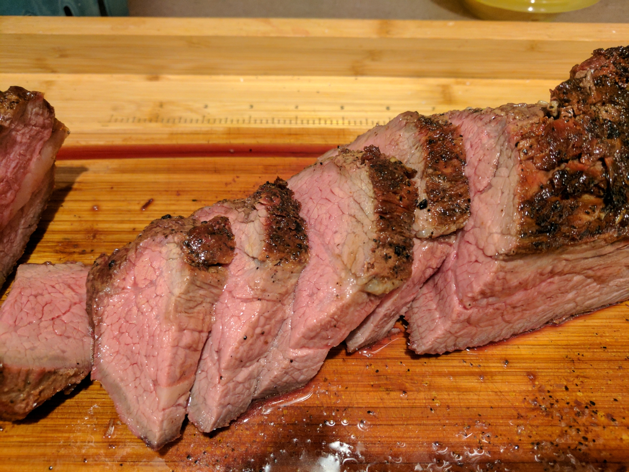 Heated grill to hot about 15 minutes, rubbed with olive seared each side about 8 minutes then turned heat to one side with meat on cool side with cover down bring to about 350 or medium and roast for about 35-40 minutes. Loosely cover with tin foil and rest for 15-20 minutes. Sliced against grain which is tough since the grain goes 2 ways so I cut along the different grains first.