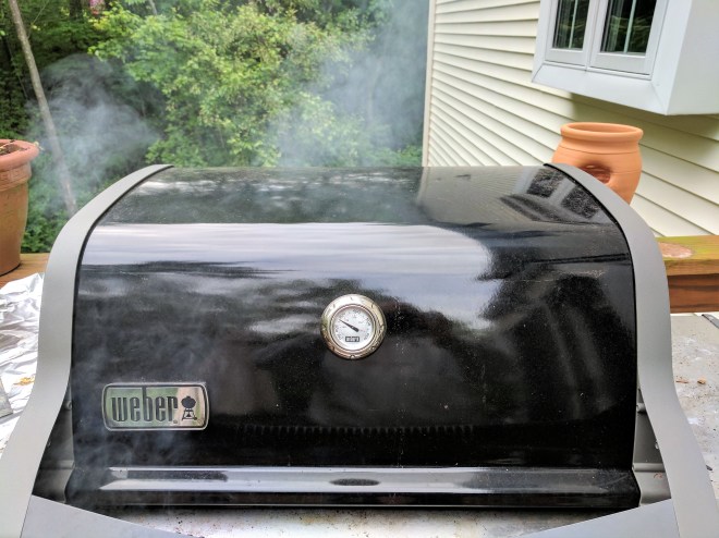 Close the lid, watch the temp so it does not go to high, mine stayed around 250-300. I waited an hour by this time the chips were long smoked out and then turned so the other side is facing the heat.