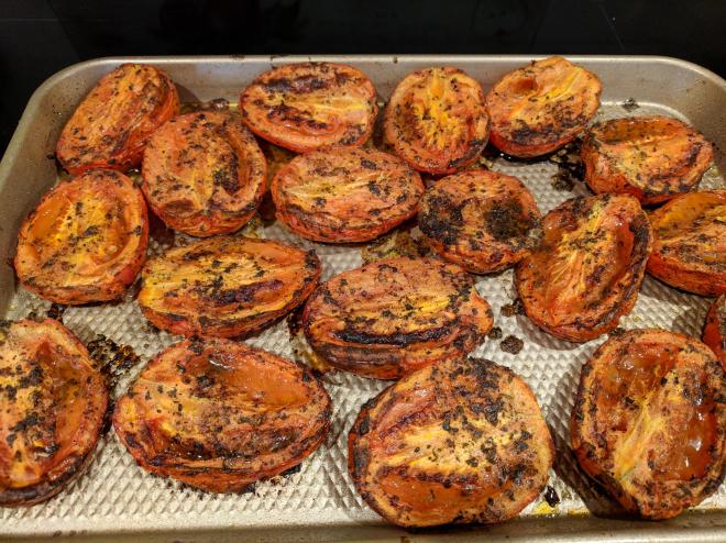 Preheat the oven to 400 degrees F. Toss together the tomatoes, 1/4 cup olive oil, salt, and pepper I also add a small amount of dried basil or even crushed dried rosemary. Spread the tomatoes in 1 layer on a baking sheet, drizzle any left oil mixture and roast for 45-55 minutes. I like them to get caramelized.