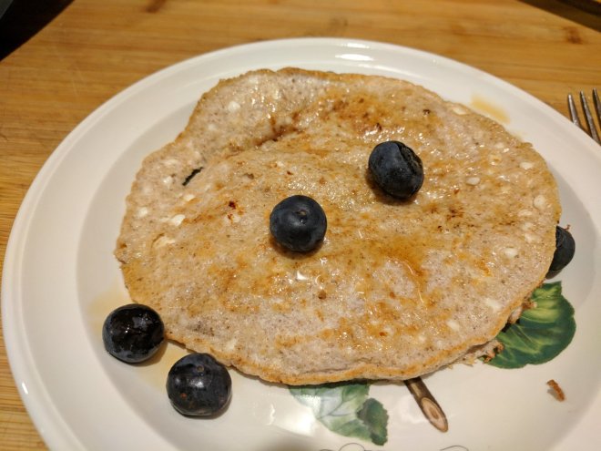 Cook until it slides around maybe a few minutes. This is the tricky parts and does take a few times to learn. Flipping when it slides but notice if it is jiggley, sorry to get so technical, wait…when it is not jiggly flip cooking for a few minutes. Top with a spalsh of maple syrup, not to much just a hint. Thia is for one serving.
