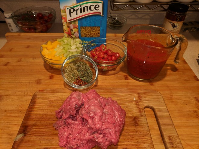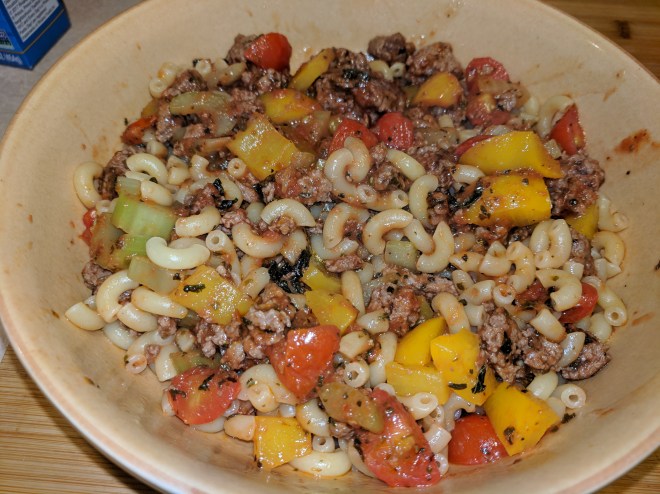 I had a bowl full of cherry tomatoes, a yellow pepper and a pound of 90% burger from wholefoods and even though Lyn is not crazy about this dish I had a craving. So in this case the heck with her its all about me this time. I grew up calling a similar dish American Chop Suey so I based it a lot on my recipe but i’ve seen it been called Goulash so since this was different I ‘ll call it such.