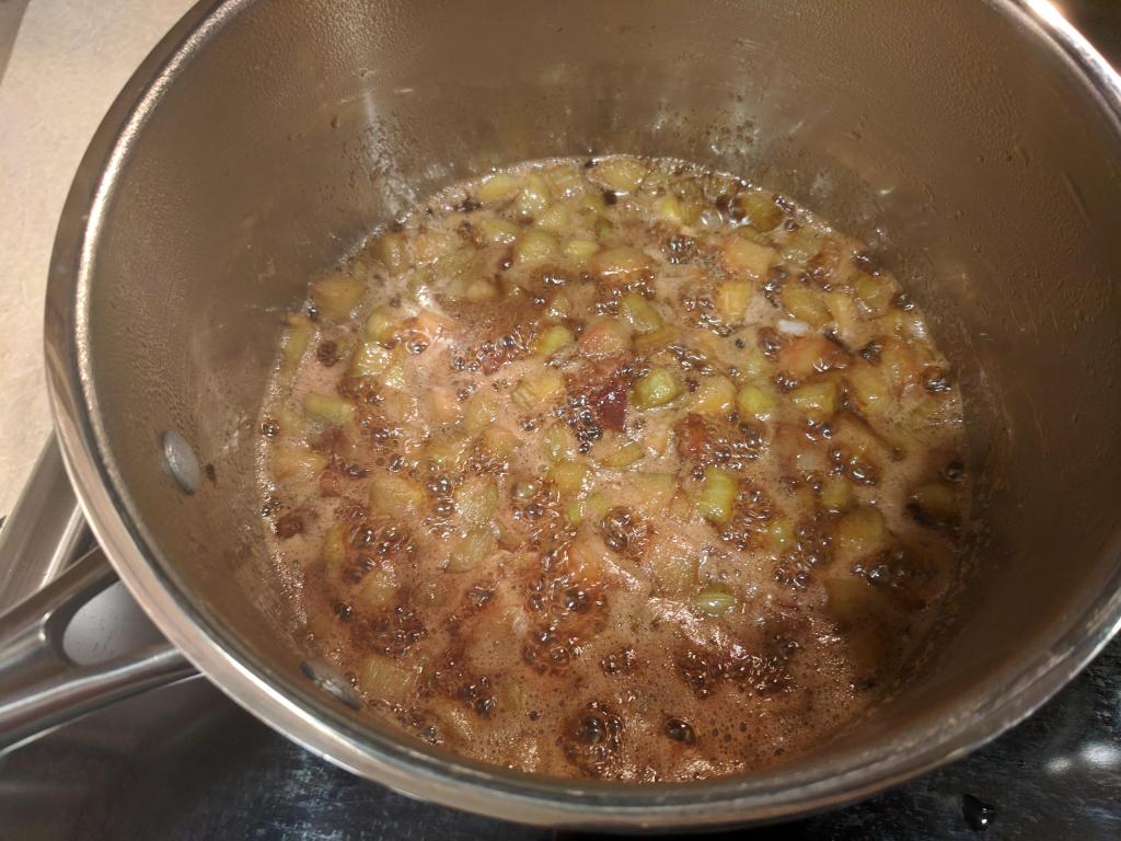 - Combine rhubarb, raisin, onion, sugar OR liquid stevia, and vinegar together in a large pot. Bring to a boil and reduce to a simmer, uncovered. Let simmer for about 20 to 30 minutes till it breaks down into a coarse, relatively thick purée; you can use the back of your spoon to encourage it along.