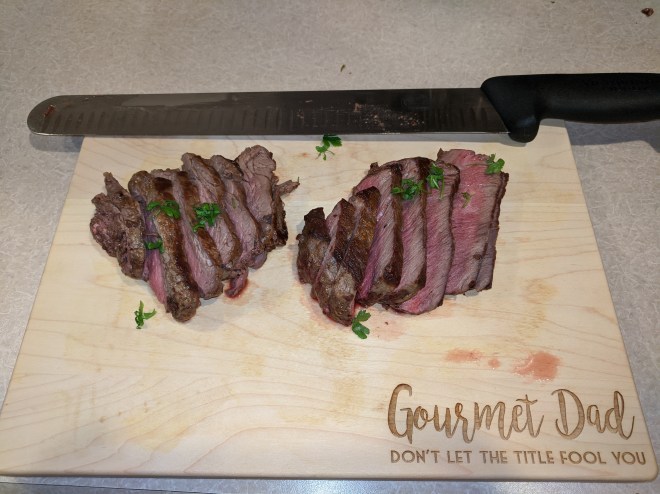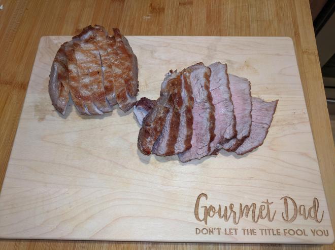Every year Lyn and I celebrate the new year with a Pan Seared oven roasted Tenderloin. This year I got to present on my new cutting board a Christmas Gift from my son. I’m getting so showy.