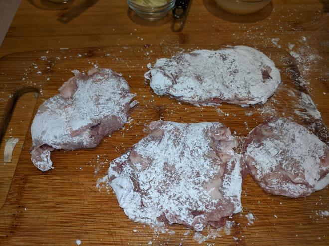 Slice pork into 2-inch thick slices. Place each slice between two pieces of plastic wrap and use the flat side of a meat tenderizer to flatten to ¼-inch thickness. (Season with salt and pepper)