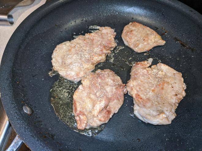 Place 4 pieces of pork in the pan and cook, turning once, until browned on both sides, 2 to 3 minutes per side. Transfer to a platter and keep warm under a tent of foil. Warm the remaining 1 Tbs. oil in the pan and repeat to brown the remaining pork. Place that pork under your foil tent as well.