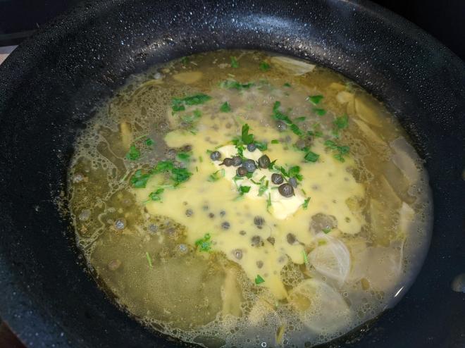 Remove the pan from the heat and whisk in the remaining 2 Tbsp. butter, the capers and parsley. Season with salt and pepper.