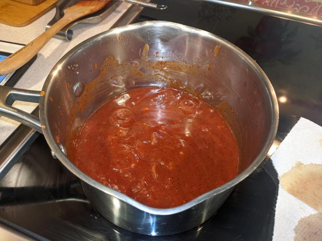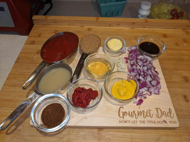 For Christmas Lyn got me a taste of Texas, Austin Texas to be exact Blacks BBQ . It had been years since I was there, but it did not disappoint. It came frozen so after it defrosted, I followed the simple directions to reheat. Wrap in tin foil place on pan * into a preheated 350 degree oven for 45 minutes to 1 hours until internal temp was between 110 and 120. I stuck in my remote temp gauge and began to prepare my Texas style BBQ sauce. Once it came to temp, I added another step and wrapped the whole thing, foil and all, in a towel and place in a small cooler with lid closed. It was in there for maybe 3 hours. Placing it wrapped in a cooler let it sit and absorb the juices and when I took it out it passed the flexible test gently dropping on each side. Ok enough about the brisket here is the sauce, a friend of mine in Dallas taught me this recipe which I have tweaked since.