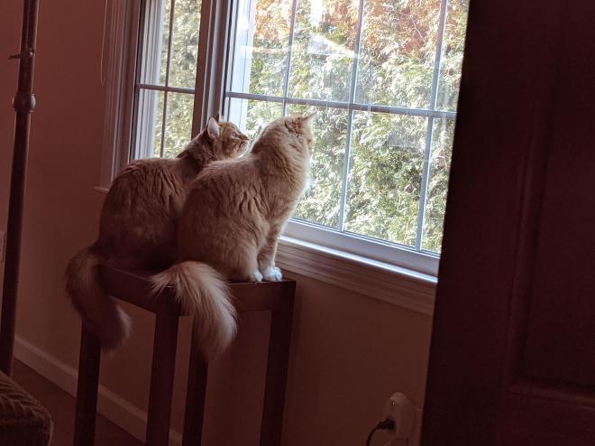 Mike was moving in with Gail and we volunteered to watch the cats to make the move easier. They quickly settled in but being cats, curiosity was top on their list. They knew where to hide when I went out for the mail so many escape attempts were just that attempts. Lyn did say that if they got out all we had to do was open a can of food and boy do they come running, begging and demanding. If you listen to them, we never fed them and there was never a bowl of dried food always at their ready night and day.