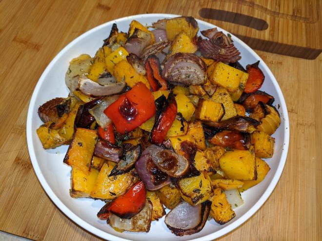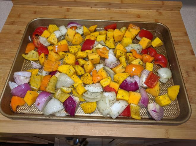 Got some orange beets, butternut squash, red and orange peppers and red onions from Misfits and had just receive some pork chops from Butcher Box so I figured this would make a good meal.