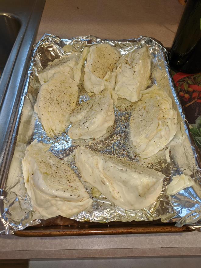 Brush both sides of each cabbage wedge with olive oil. Sprinkle garlic powder, red pepper flakes, salt, and pepper over each wedge. Arrange wedges on a baking sheet.