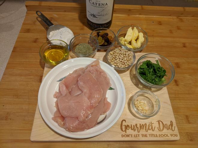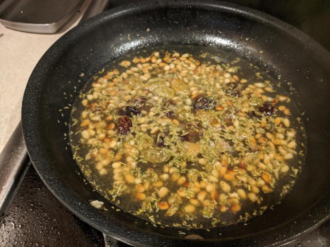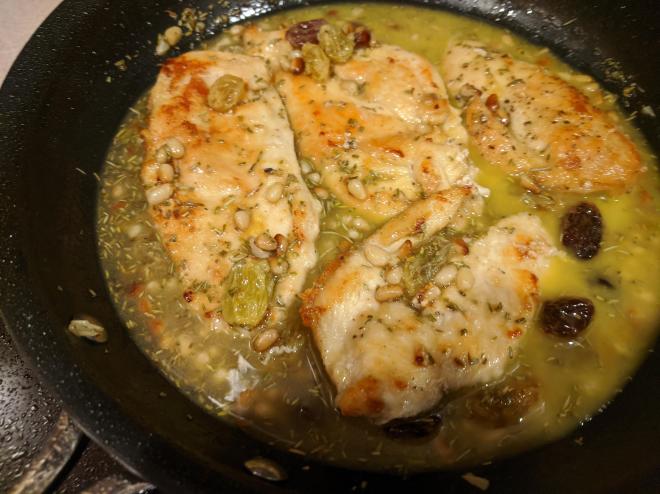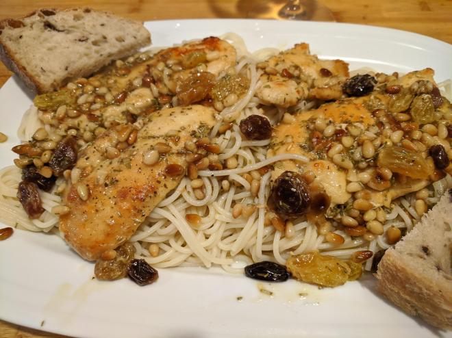 Pan fry 3-5 minutes until golden and remove to plateToast pine nuts then add wine, raisins, rosemary bring to boil and then bring to simmerSwirl in butter add chicken back in and simmer for 5-9 minutesplace chicken on top of bed of spaghettini and top with sauceSprinkle with chopped parsley and serve. we served with a slow rise olive bread from Nashoba Brook Bakery
