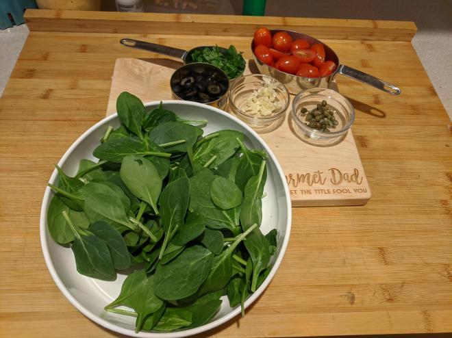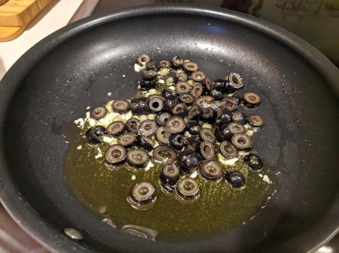 Meanwhile, heat the oil and garlic in a large skillet over medium heat until the garlic starts to sizzle, about 3 minutes. Add the olives and capers and cook for 2 minutes more.