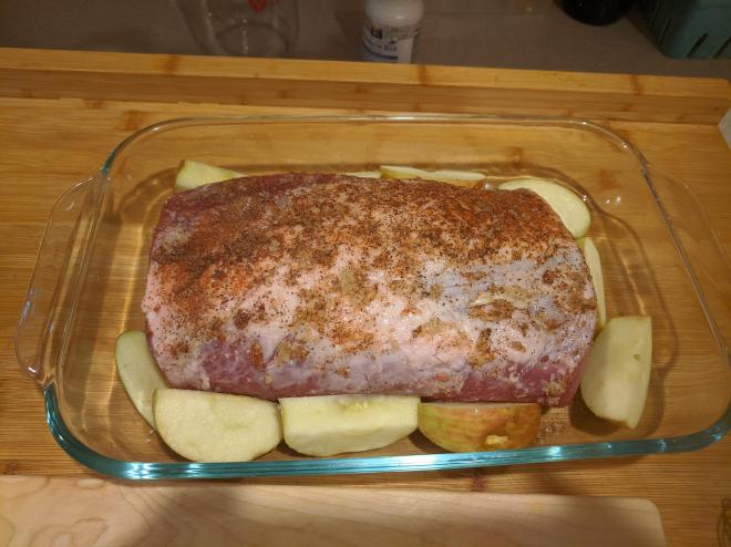 Mix the seasonings (salt, pepper and paprika) in small bowl and rub it on the pork. Spread apple around the roast.
