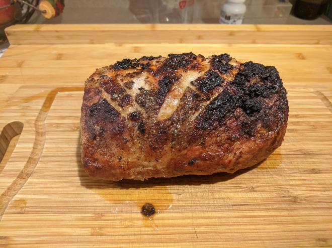 Cook the pork for 60-75 minutes or until it has reached a temperature of 150-160 degrees.