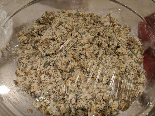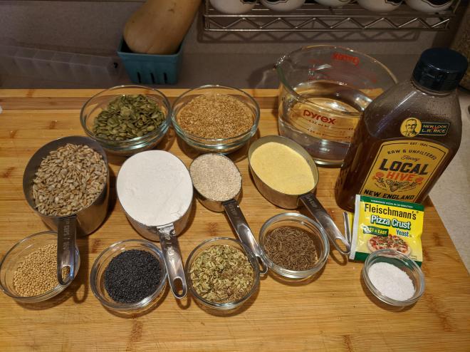 In a large glass bowl, combine the flour with all the seeds and the cornmeal. Stir in 2 1/4 cups water. Cover bowl tightly with plastic wrap, and let sit overnight, 8 to 12 hours.
