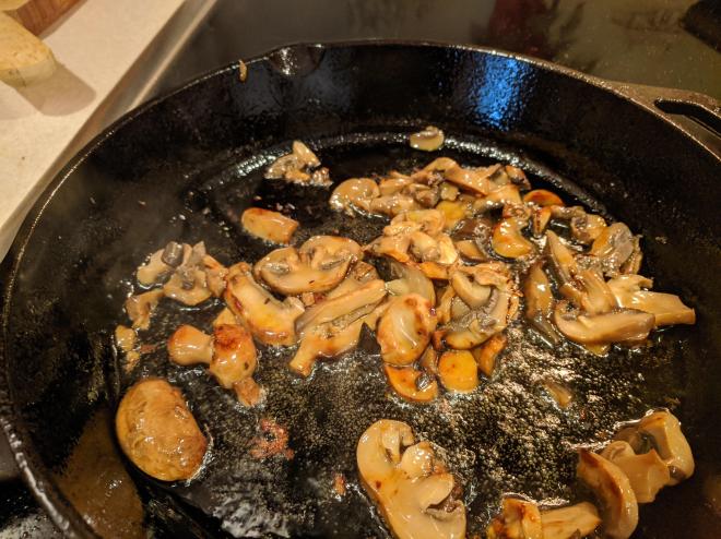 4. Without wiping out the pan, add the remaining 1 tablespoon olive oil. Add the mushrooms with a pinch of salt and pepper. Lower the heat, and cook, stirring, for 3 minutes.