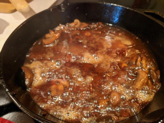 5. Add the wine and stock or water with any reserved marinade from the bowl. Bring to a boil, lower the heat, and let the mixture bubble steadily for 6 minutes, or until it is reduced and starts to look syrupy.