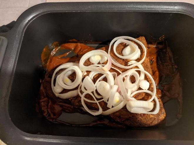 I usually don’t like the texture of meat cooked in a crock pot it always seems on the dry side to me. I think this is just personal preference. This recipe came out good and when topped with my BBQ sauce it was very tasty. I had this sliced and pulled on a bun. It’s a very easy recipe to throw in the slow cooker walk away and get very hungry every time you enter the room.