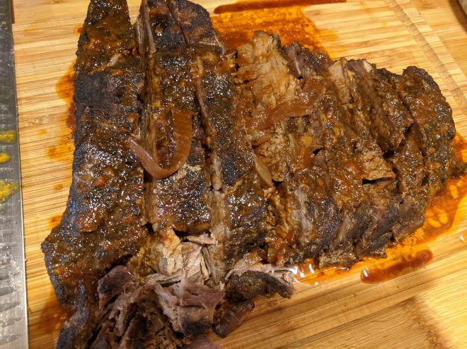 Cook on Low until brisket is very tender, 6 to 7 hours. Scrap the fat cap off with spatula or knife. Rest brisket 10 minutes before slicing or shredding; serve with sauce.