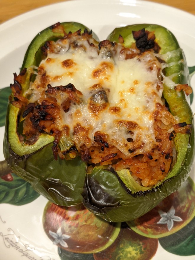 I made stuff pepper with rice, diced sweet onion, ground sirloin, tomatoes sauce and a little red wine vinegar. I also had some green beans that were starting to look peaked so I dice them and added it. Cook inside a half of green pepper with a little water on the bottom of the pan and topped with cheese and turned on the broiler when the pepper had cooked enough.