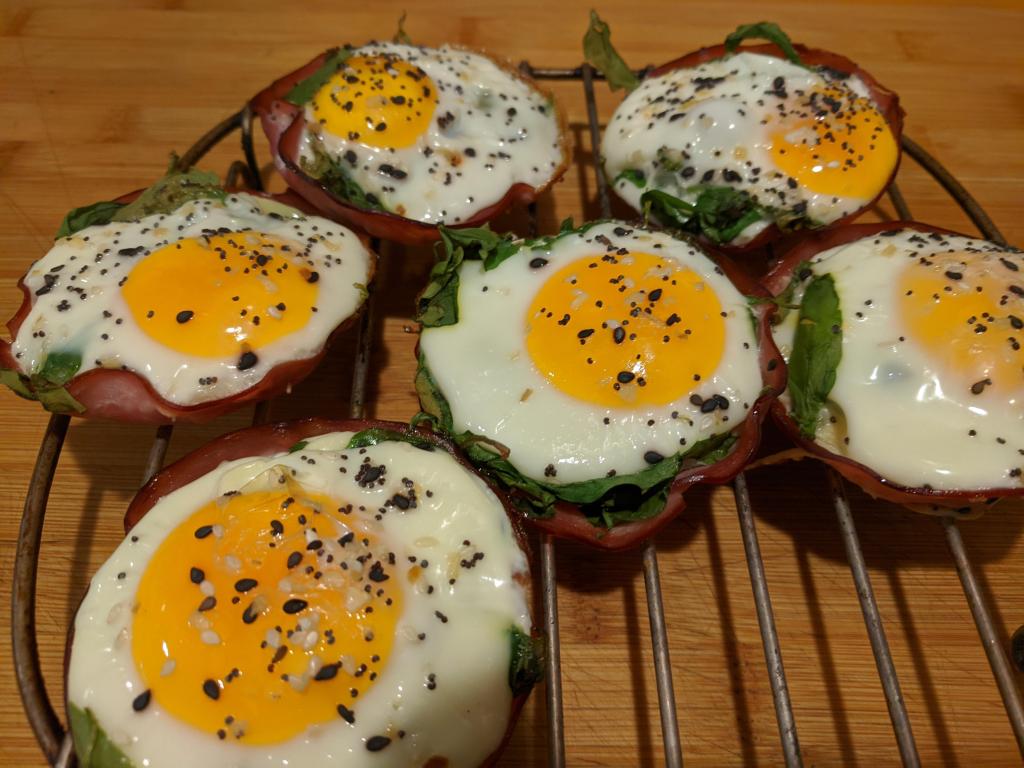 In muffin tin in oven. Thin slice of ham. I get Ultra thin from Whole Foods or can use any breakfast meat on bottom. Then put leaf of spinach or basil ove another herbs, drop egg into cup, sprinkle with spice. I like Trader Joe’s everything but the bagel spice. Bake 350 for about 20 minutes. Viola!