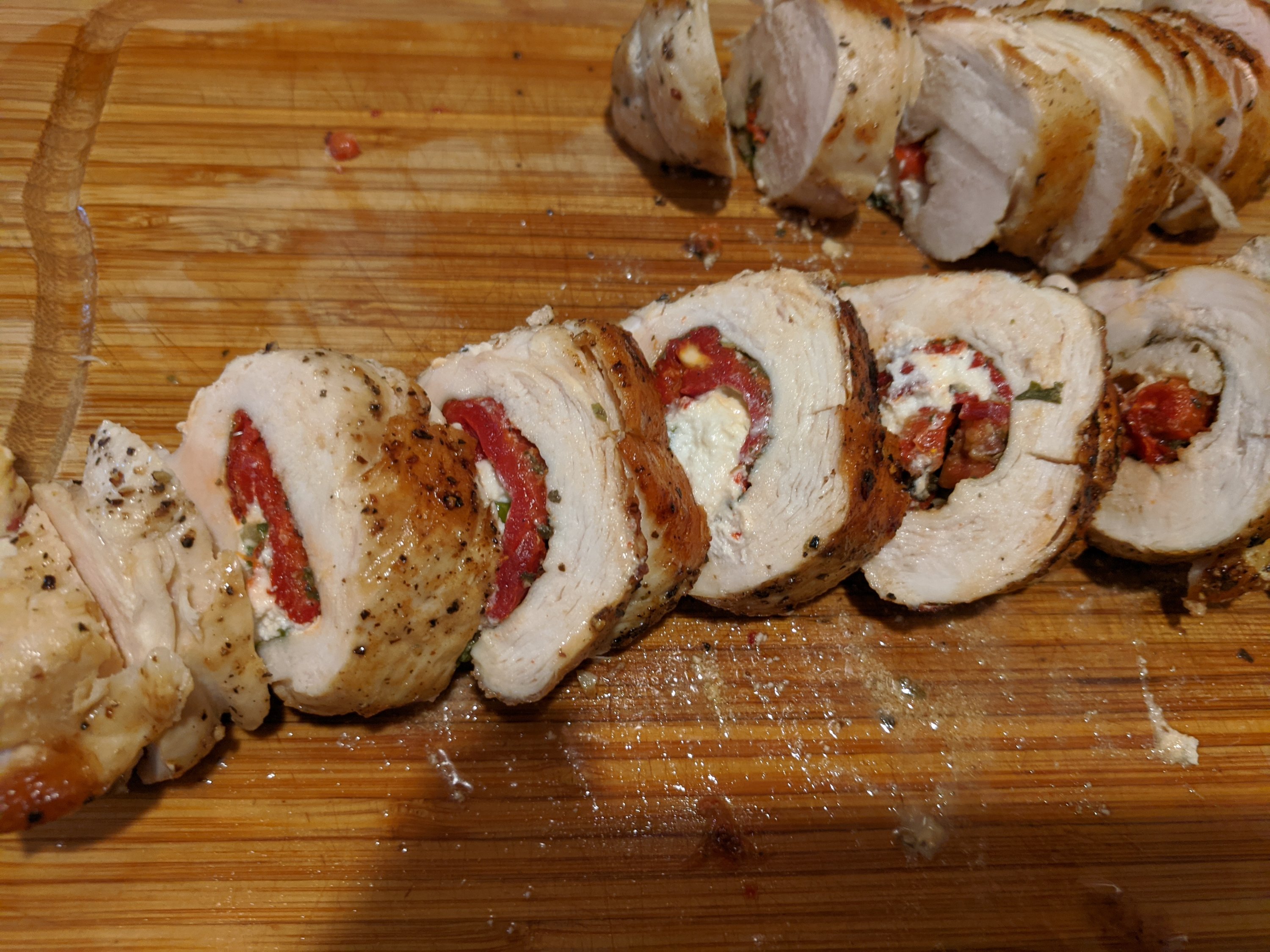 Pound chicken breast Sprinkle with salt, pepper, and dried basil (had no fresh) In center put layer of sun-dried tomato, goat cheese, roasted red pepper.