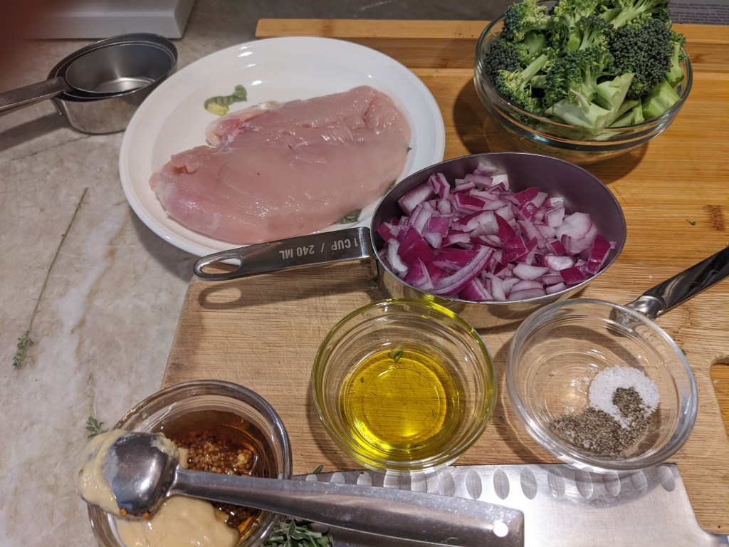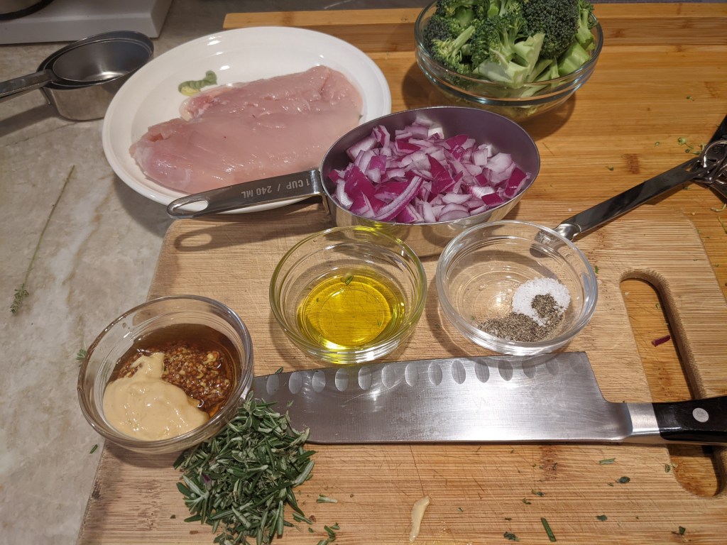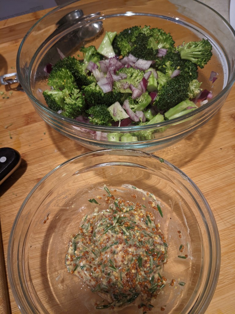 Step 1 Preheat oven to 350 degrees F. Combine broccoli, onion, olive oil, 1/8 tsp. pepper, and salt in a medium bowl; toss to coat. Mix together whole-grain mustard, Dijon mustard, rosemary (or thyme), and maple syrup (or honey), if using, in a small bowl.