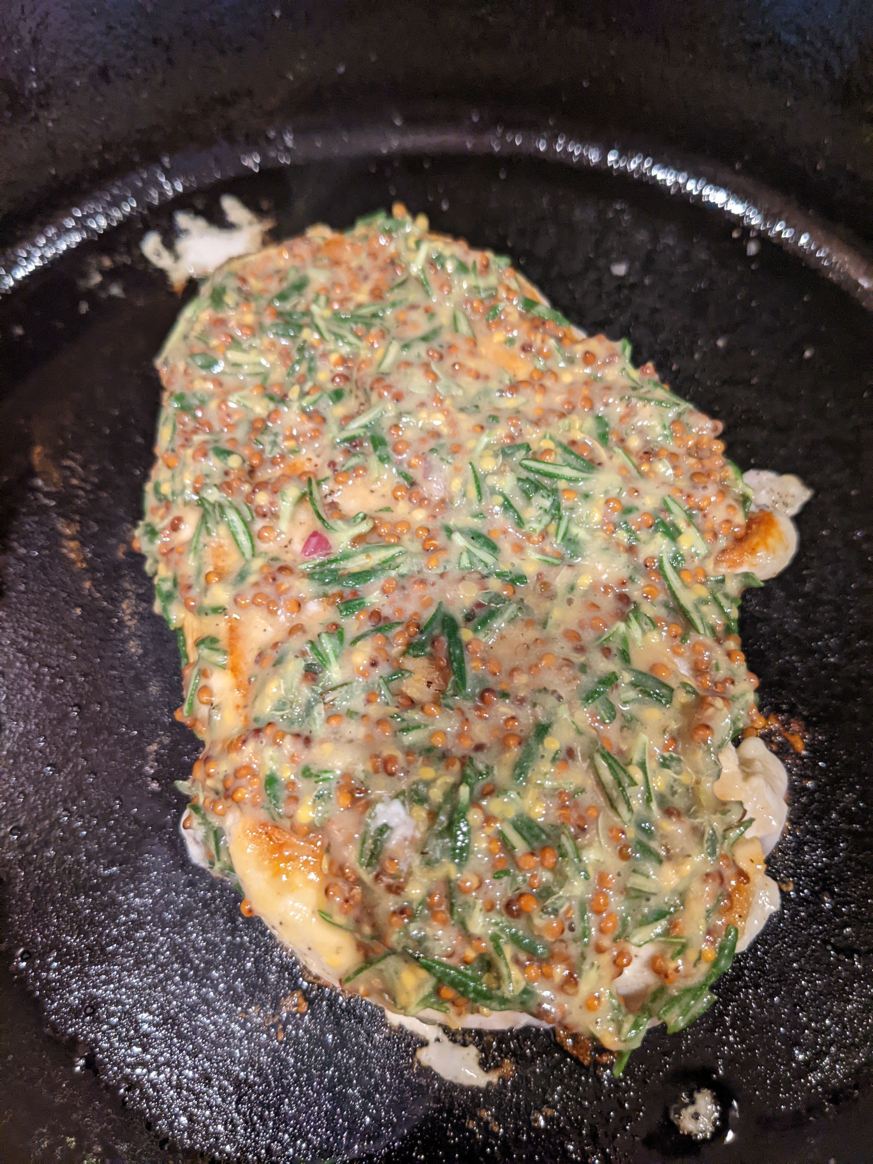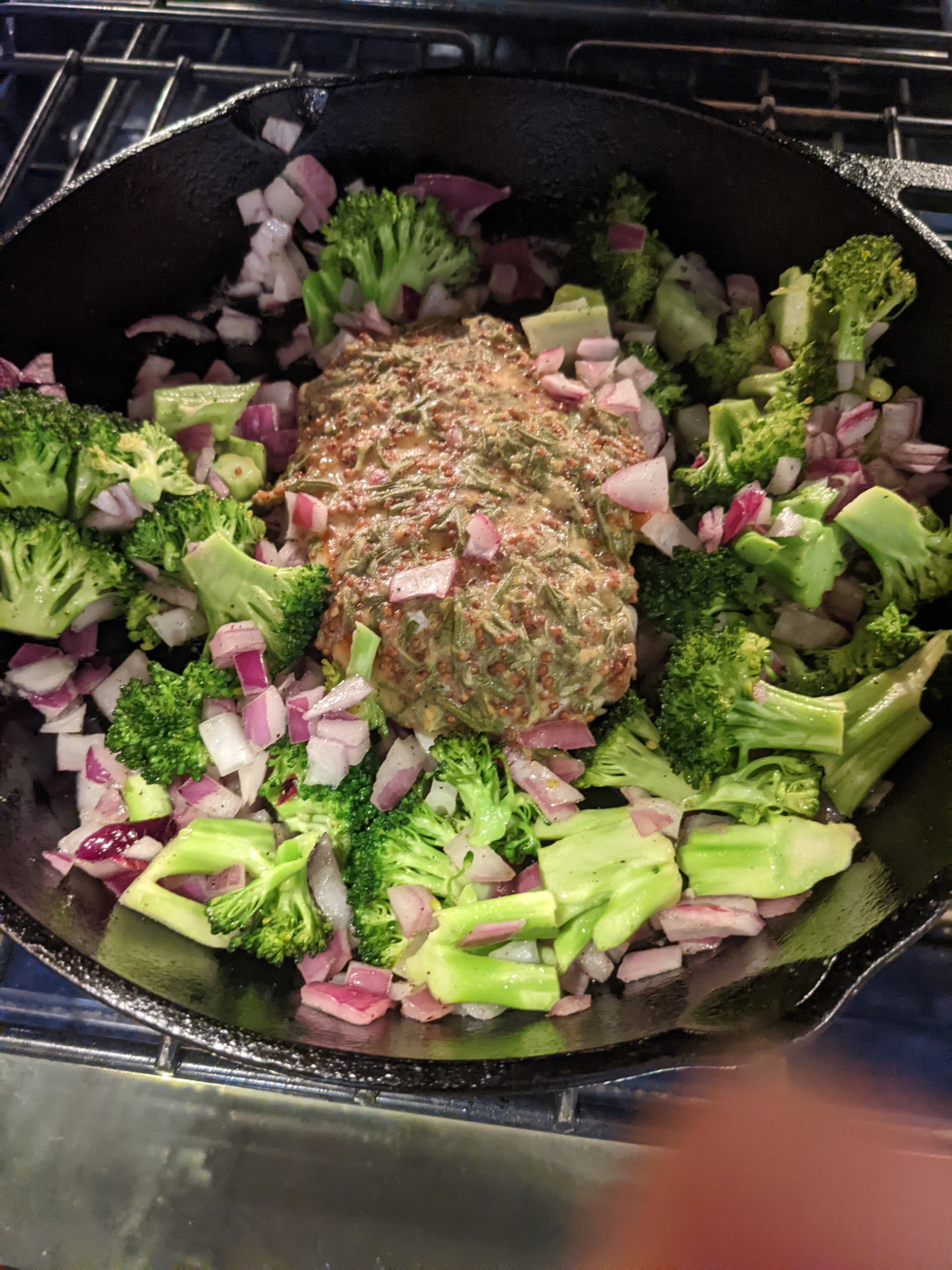 Step 2 Pat chicken dry and season with the remaining 1/8 tsp. pepper. Heat canola oil in a 10-inch cast-iron or other ovenproof skillet over medium-high heat. Add the chicken and cook until the underside is nicely browned, 3 to 5 minutes. Remove the pan from the heat. Turn the chicken over and brush the mustard mixture over the top. Scatter the broccoli mixture around the chicken. Transfer the pan to the oven (see Tip).