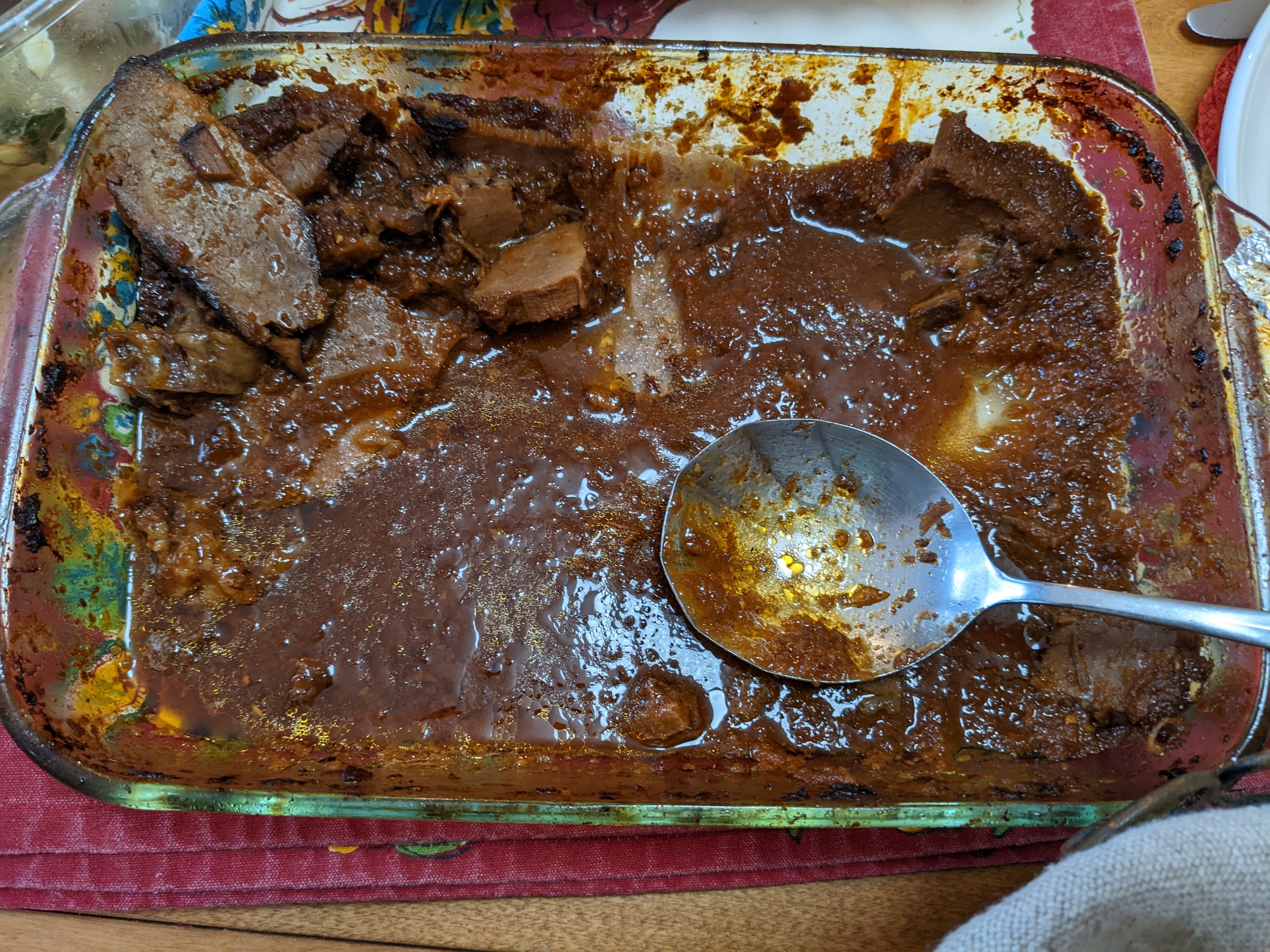 The result is sublime and the dish only improves if it’s cooked a day in advance of serving it. However, you can prepare and serve it the same day, if you’d like, though you may want to use a fat separator to strain the fat from the finished sauce. Several readers commented that the original cooking time and temperature on the recipe (3 hours, including 1 hour uncovered, at 350 degrees) was inaccurate. We’ve retested and adjusted the recipe, so the brisket now cooks for 5 to 6 hours, covered, at 325 degrees. Please also note that this recipe is not kosher for Passover. #Cooking