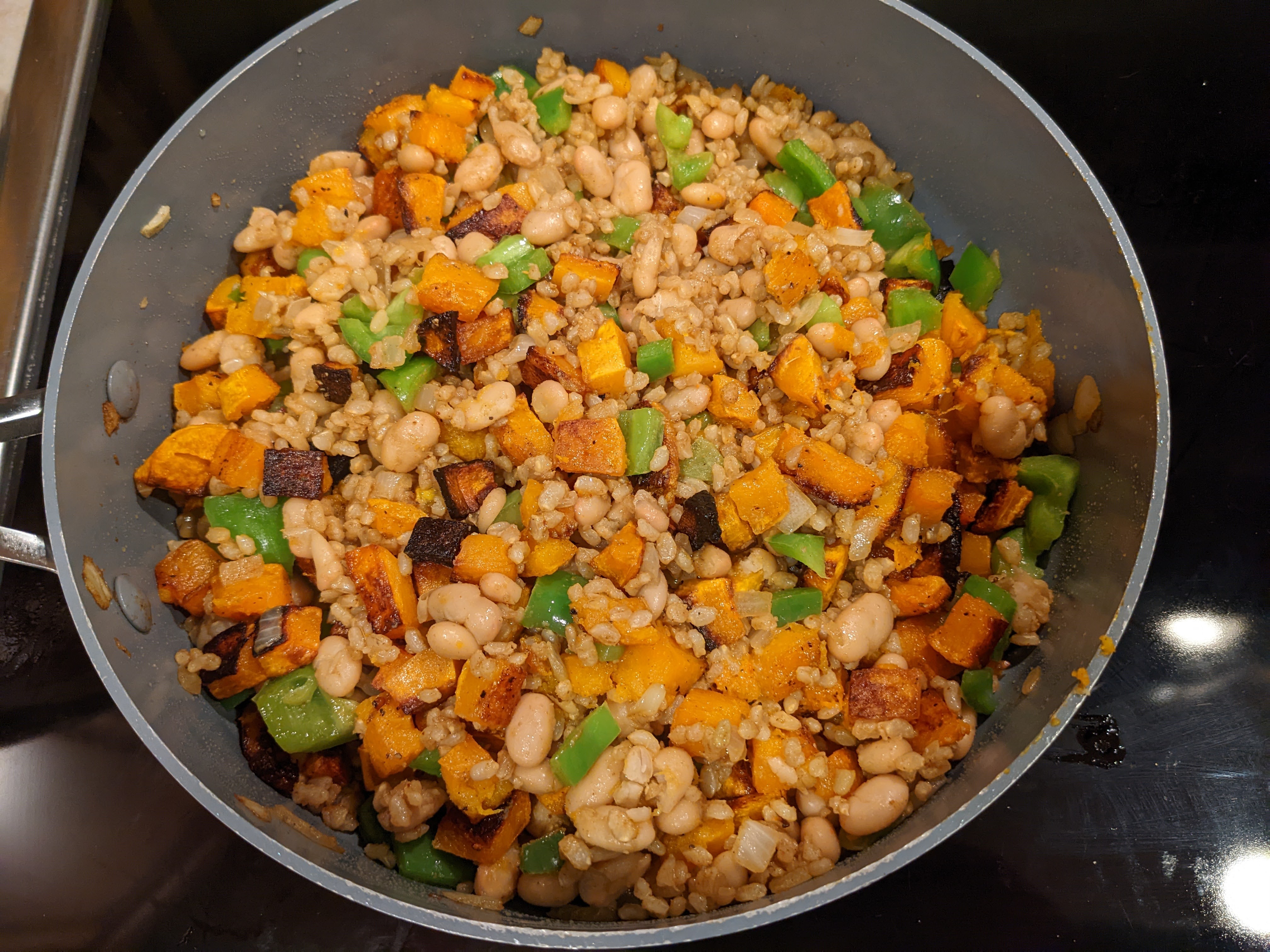 5. When butternut squash is tender remove from oven and cool slightly. Add 1.5 cups of the cooked butternut squash to the skillet and stir well. You can mash the squash with a fork if some pieces are too large. Add cheddar cheese and heat another couple minutes.