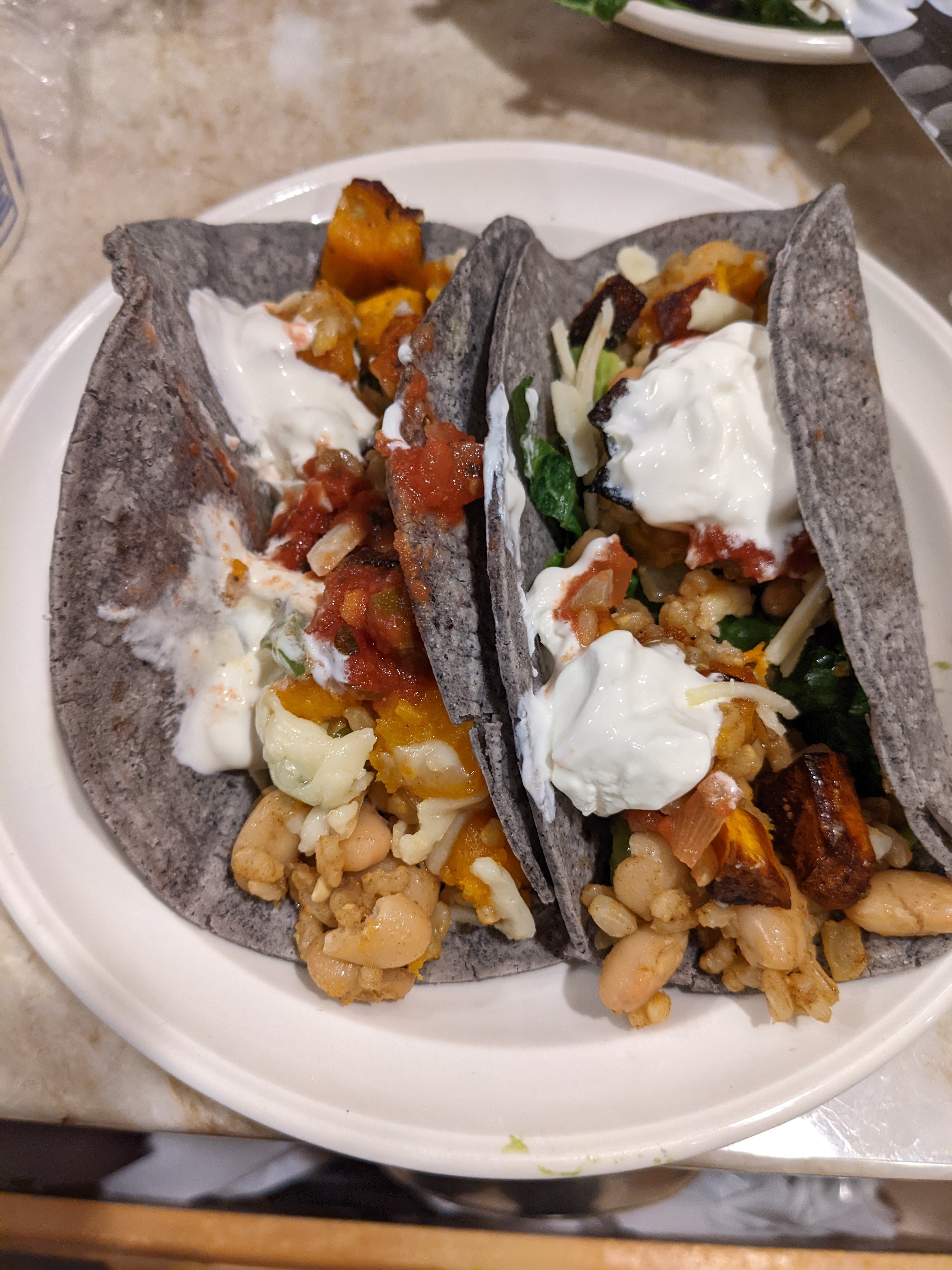 Ok it was Taco Tuesday and I had planned to make Black Bean Butternut Squash Burritos but when I looked I had no black beans and only 1 tortilla wrap so what to do. I had frozen some blue corn taco shells and I had a can of navy beans, so I went with it.