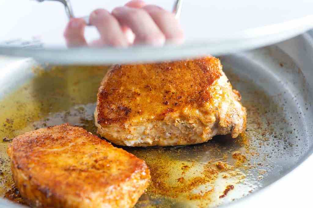 • 5. Flip the pork so that the seared side is facing up. If there is a fattier side of the pork, use kitchen tongs to hold the chops fat-side-down until it sizzles and browns slightly, about 30 seconds.