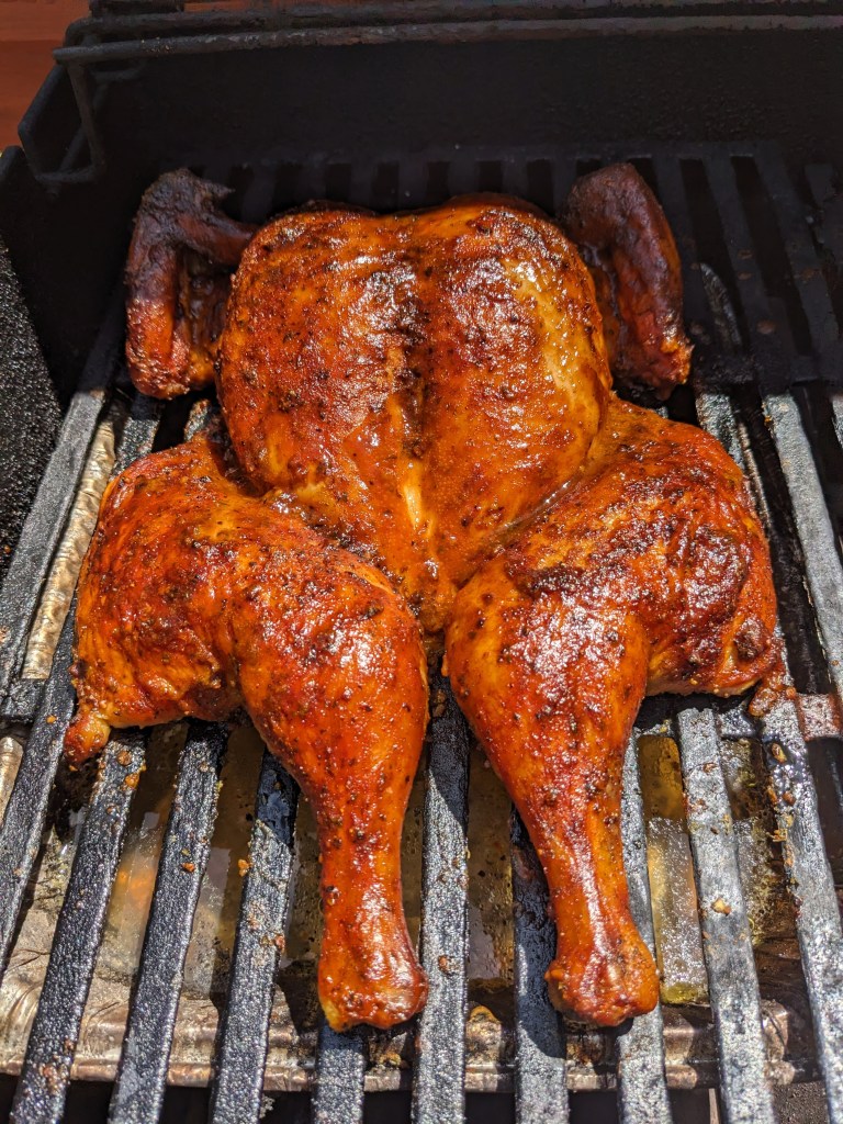 Cooking a whole chicken, whether on the grill or in the oven, can be a little more tricky because it contains both white and dark meat. Position the chicken with the legs pointed towards the hottest part of the grill or the back of the oven. Cook the chicken until a meat thermometer inserted in the thickest part of the thigh registers 155°F. Thighs typically take the longest to come up to temperature, so by this time, the breast will be above 160°F. Let the chicken rest for about 10 minutes and carryover cooking will bring the thigh temperature to 165°F. Cooking a whole chicken requires compromise — in order for the dark meat to be cooked through, the white meat will have to cook a little longer than necessary.