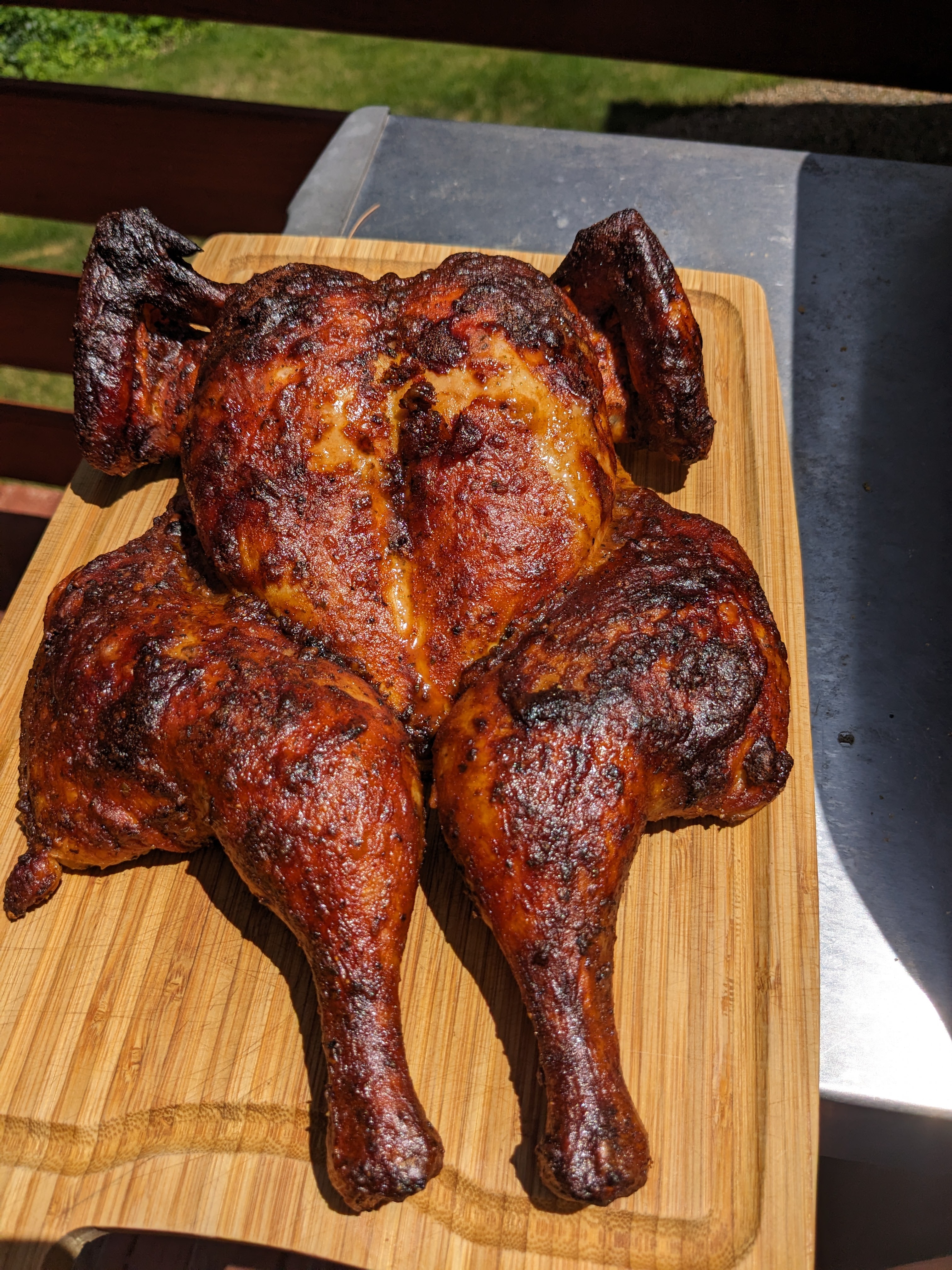 Cooking a whole chicken, whether on the grill or in the oven, can be a little more tricky because it contains both white and dark meat. Position the chicken with the legs pointed towards the hottest part of the grill or the back of the oven. Cook the chicken until a meat thermometer inserted in the thickest part of the thigh registers 155°F. Thighs typically take the longest to come up to temperature, so by this time, the breast will be above 160°F. Let the chicken rest for about 10 minutes and carryover cooking will bring the thigh temperature to 165°F. Cooking a whole chicken requires compromise — in order for the dark meat to be cooked through, the white meat will have to cook a little longer than necessary.