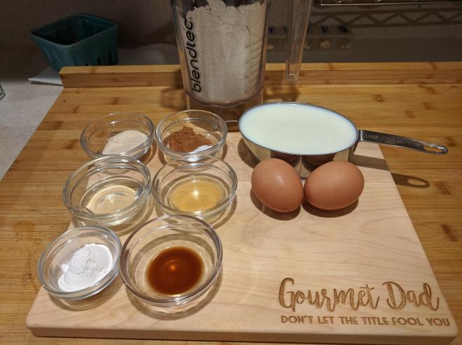 In a large mixing bowl, combine oat flour, sugar, baking powder, cinnamon, and salt. Stir to combine.