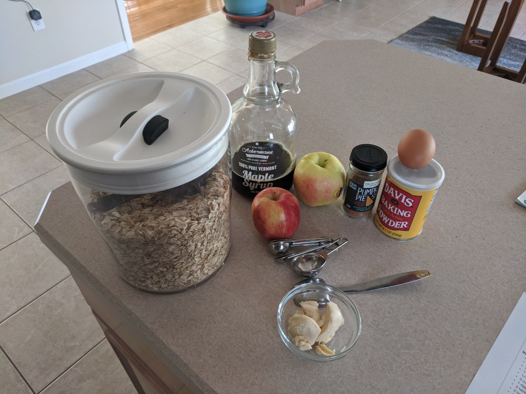 In a large mixing bowl, stir together oats, pumpkin pie spice, baking powder, and salt. Once mixed, whisk in the almond milk, egg, maple syrup, and melted butter.
