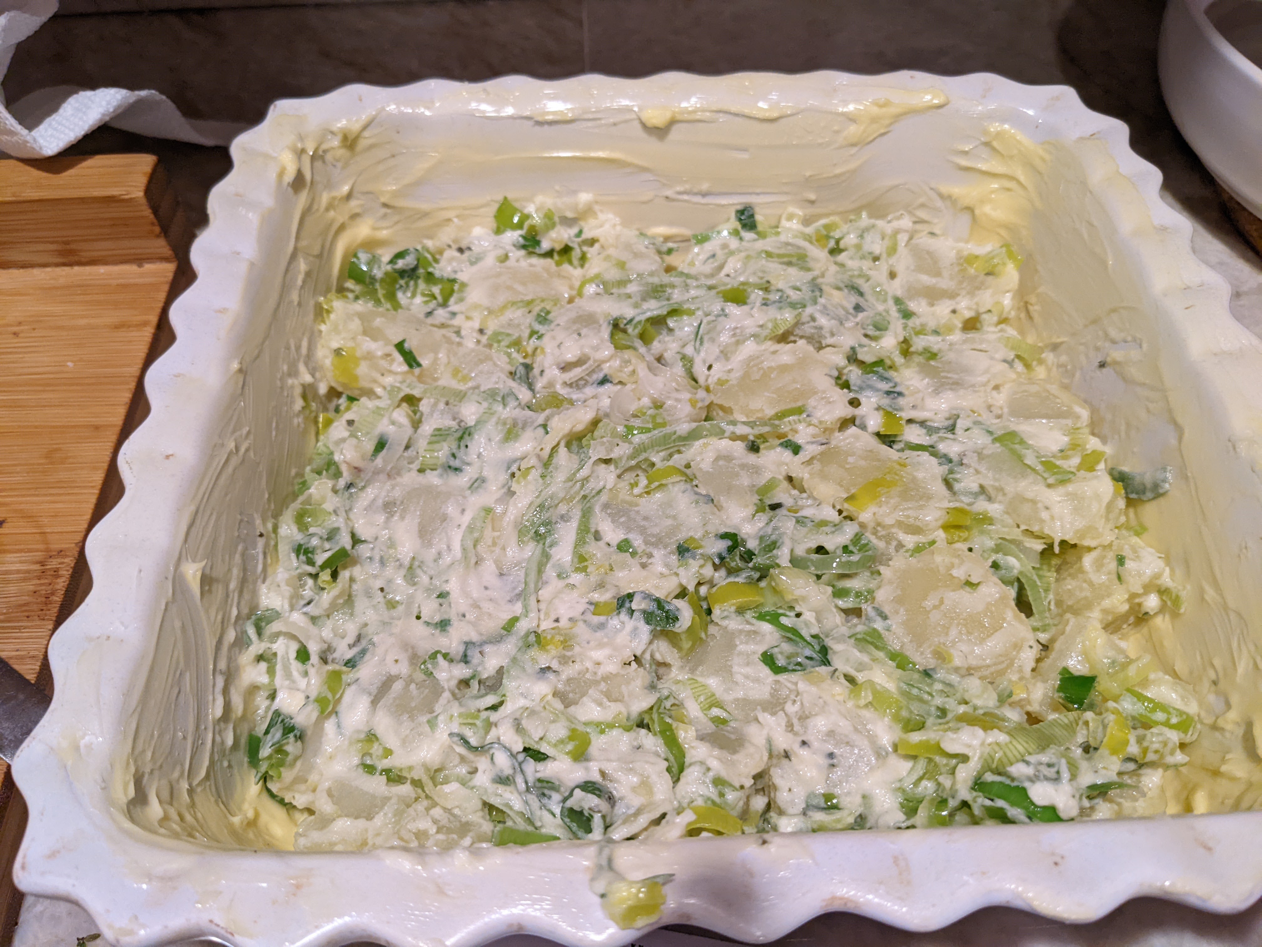 Transfer the potato mixture to the baking dish. Pour the egg mixture over the potatoes. Cover and refrigerate overnight or for up to 2 days.