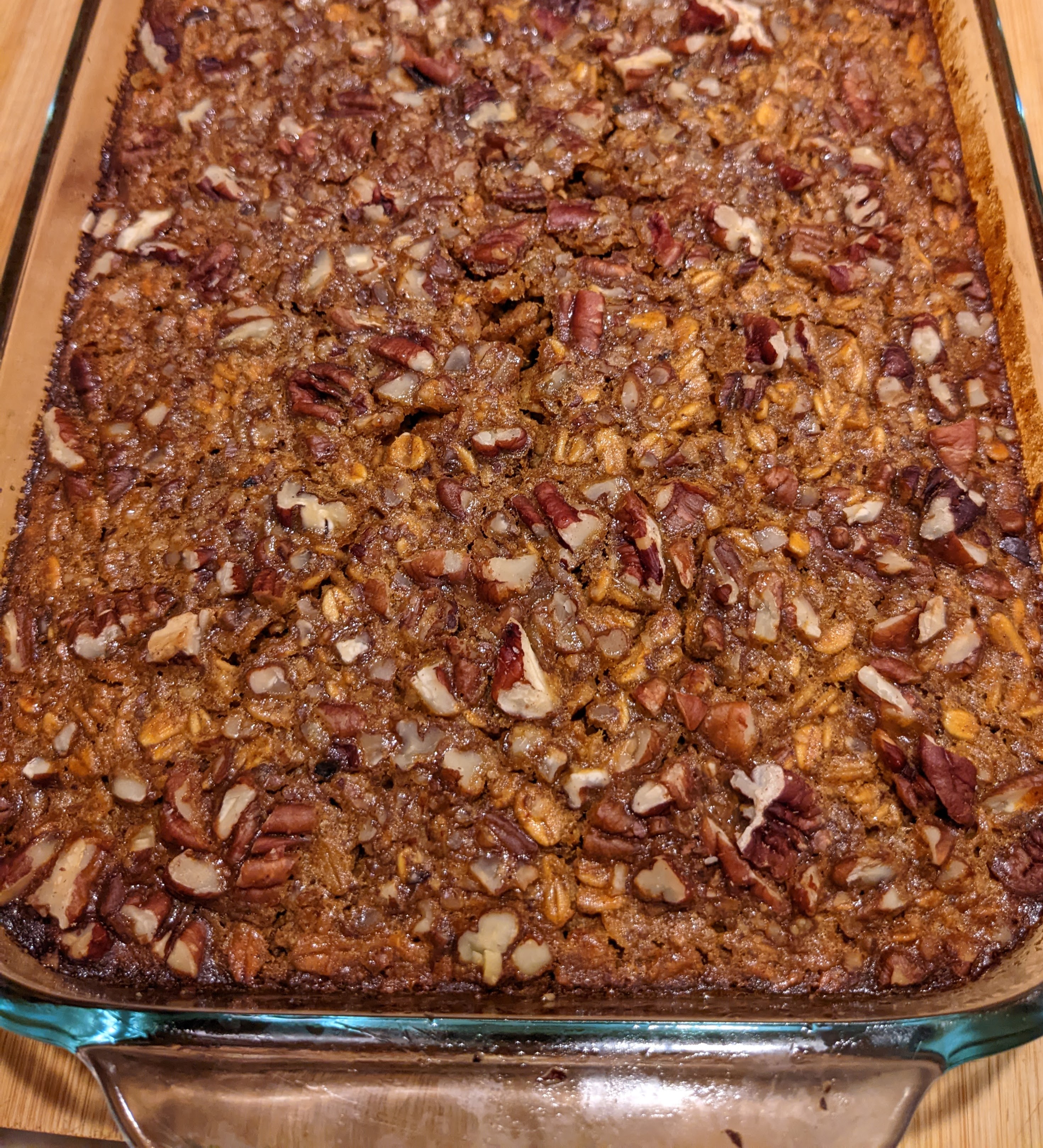 Step 2 Combine oats, milk, pumpkin, eggs, maple syrup, oil, pumpkin pie spice, cinnamon, baking powder, vanilla and salt in a large bowl; mix well. Pour the mixture into the prepared baking dish; sprinkle with pecans.