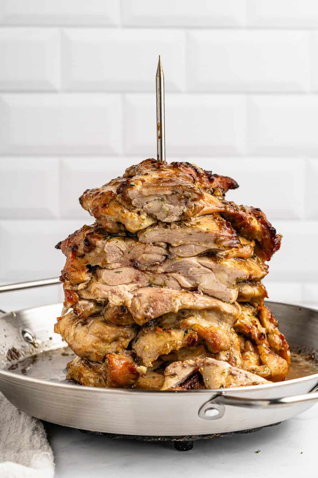 Nonna: When I say this is the juiciest 💦 chicken that will ever grace your mouth, I mean it! Juicer than girl’s night gossip, these Greek Chicken Gyros are meticulously seasoned and roasted to perfection. The chicken is marinated in a combination of savory, tangy and herbaceous flavors, stacked on a spit and slow-roasted until the exterior develops a slight caramelized char while the inside remains tender and succulent 🤤. Serve this Greek Chicken Gyro on a warm pita with creamy tzatziki or on top of a salad or bowl – I promise you, you’ll never want to make chicken thighs any other way!